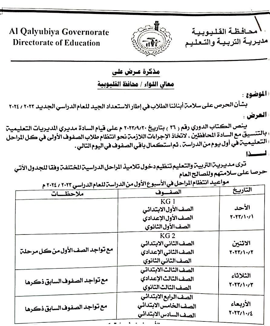 تعرف على جدول تنظيم دخول تلاميذ المراحل الدراسية المختلفة في أول يوم دراسة بالقليوبية