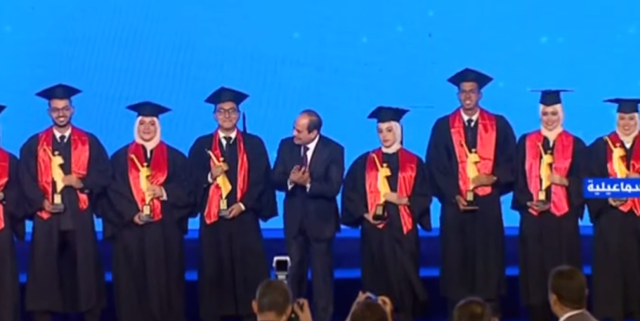 الرئيس السيسي يتوسط صورة تذكارية مع أوائل الخريجين في يوم تفوق جامعات مصر