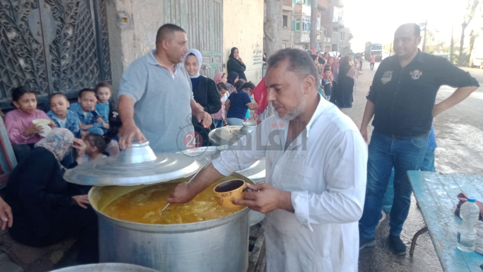 واحتشد عدد من المواطنين على المائدة التي أقامها أحد أهالي القرية، لتناول الطعام احتفالًا بذكرى المولد النبوي الشريف، وسط حالة من البهجة بين الكبار والصغار.