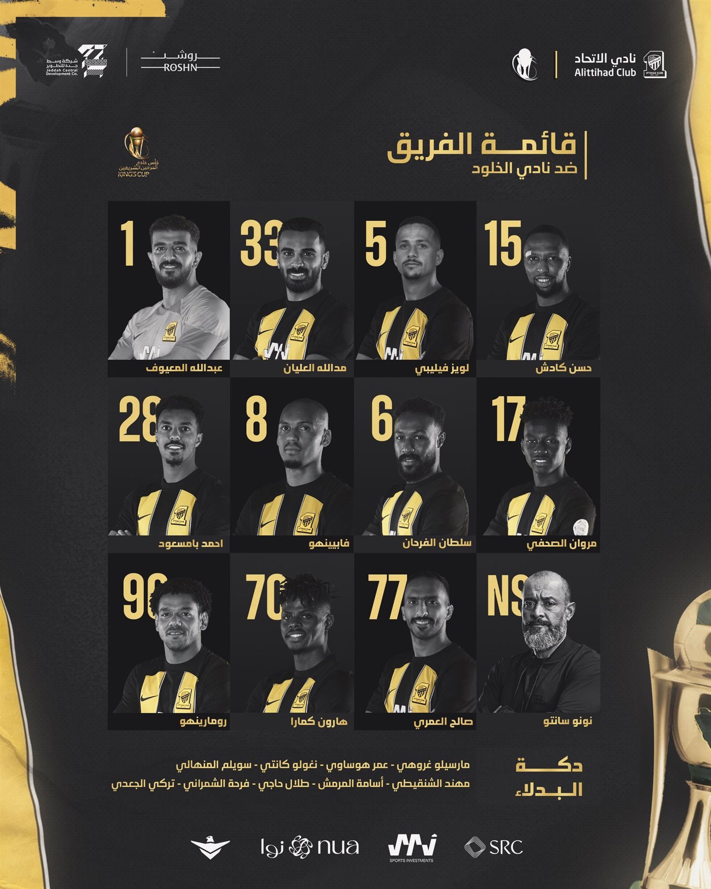 وقرر البرتغالي نونو سانتوس مدرب نادي اتحاد جدة، أن يدخل مباراة فريقه لمواجهة فريق الخلود في بطولة كأس خادم الحرمين الشريفين، بتشكيل مكون من: