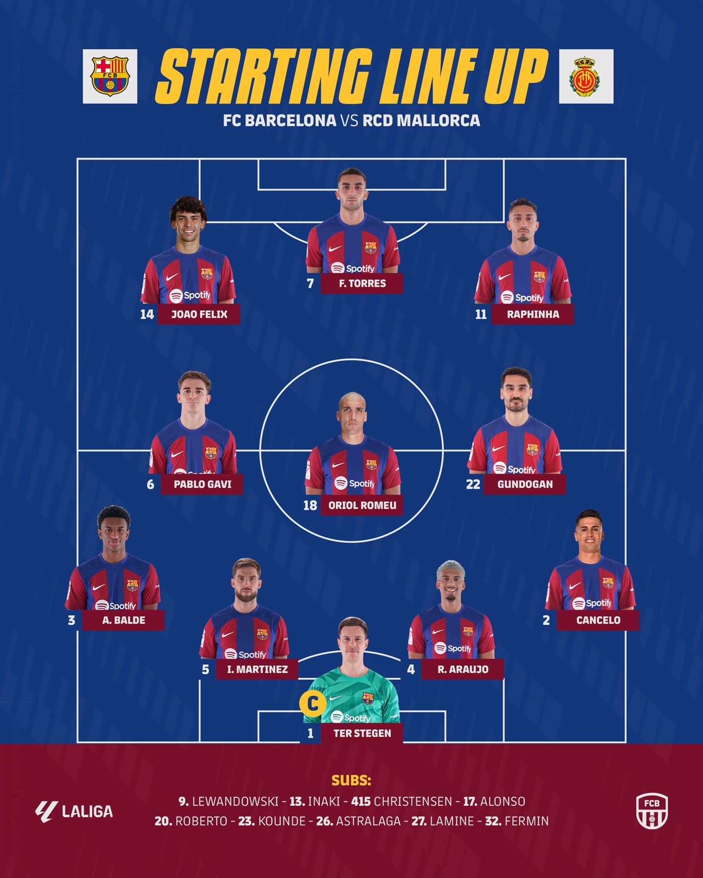 قرر المدرب الإسباني تشافي هيرنانديز، المدير الفني لفريق برشلونة، أن يدخل مباراة فريقه لمواجهة فريق ريال مايوركا بمسابقة الدوري الإسباني، بتشكيل مكون من: -
