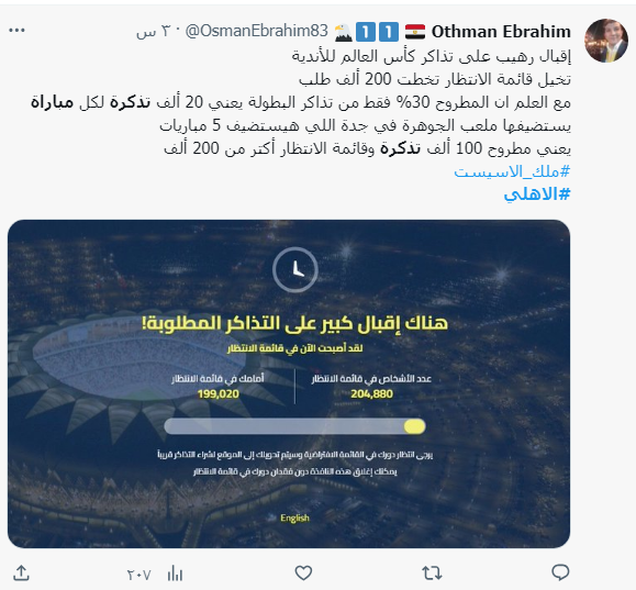 ومنذ فتح باب حجز التذاكر وتواجه الجماهير أزمة كبرى بسبب عدم قدرتهم على حجز التذاكر من الضغط الكبير من جانب جماهير الأهلي لحجز تذكرة مباراة فريقهم المتوقعة ضد اتحاد جدة في مونديال الأندية 2023.