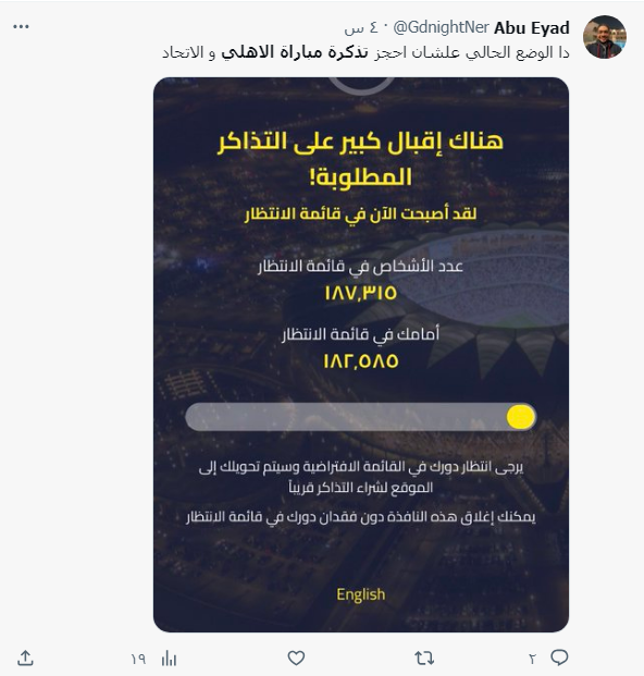 وسخرت الجماهير من تواجد عدد كبير على قائمة الانتظار لحجز تذاكر مباراة الأهلي في مونديال الأندية، حيث وصل العدد في أحد الأوقات منذ فتح باب الحجز إلى مليون ونصف.