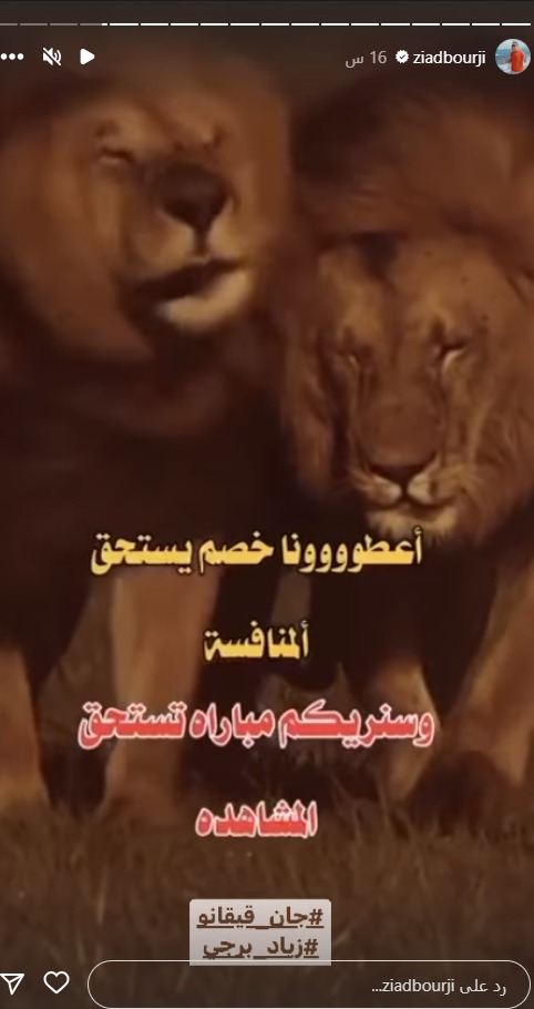 ونشر زياد برجي منشورًا عبر حسابه الشخصي موقع انستجرام، جاء فيه: أعطونا خصم يستحق المنافسة، وسنريكم مباره تستحق المشاهدة.
