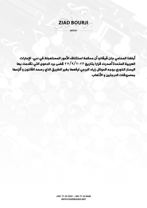 وجاء بيان زياد برجي كالتالي: أبلغنا المحامي جان قيقانو، أن محكمة استئناف الأمور المستعجلة في دبي - الإمارات العربية المتحدة ـ، أصدرت قرارًا بتاريخ ۲۷/۱/۲۰۲۳، قضى برد الدعوى، التي تقدمت بها إليسا الخوري، بوجه الموكل زياد البرجي، لرفعها بغير الطريق، الذي رسمه القانون، وإلزامها بمصروفات الدرجتين والأتعاب.
