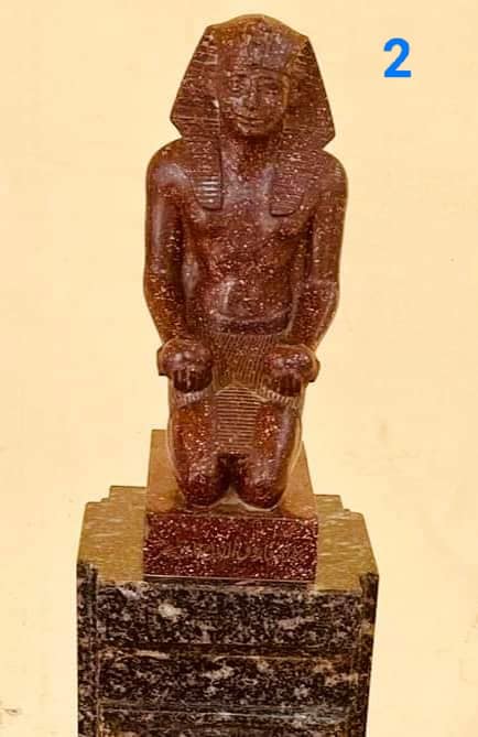 - تمثال من الجرانيت للملك تحتمس الثالث، ممسك إناء النو بجانب إهداء للملك فاروق من مدرسة أسوان الصناعية، وكان الملك تحتمس الثالث واحد من أعظم ملوك مصر القديمة الذي اشتهر ببراعته في وضع الخطط الحربية والانتصار بجميع المعارك العسكرية التي خاضها وتوسيع ملك وحكم مصر، وصُنع التمثال من الجرانيت.