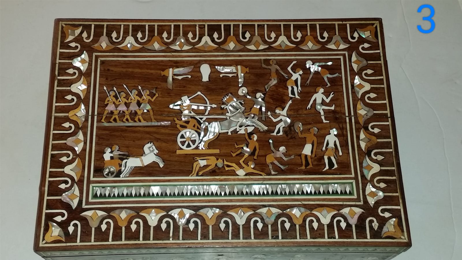 - علبة من الخشب المطعم بالصدف والعاج، وعلى الغطاء منظر لمعركة حربية مستوحى من الفن المصري القديم يظهر به الملك على العجلة الحربية وخلفه الجنود والأعداء يتساقطون على الأرض، وصُنعت العلبة من الخشب.