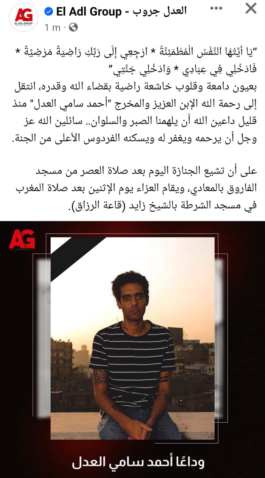 وأضافت شركة العدل جروب: بعيون دامعة وقلوب خاشعة راضية بقضاء الله وقدره، انتقل إلى رحمة الله الابن العزيز والمخرج "أحمد سامي العدل" منذ قليل داعين الله أن يلهمنا الصبر والسلوان.. سائلين الله عز وجل أن يرحمه ويغفر له ويسكنه الفردوس الأعلى من الجنة.