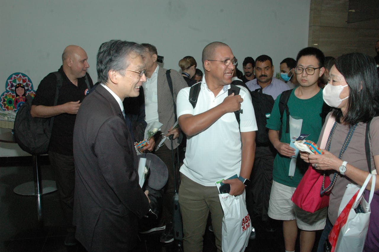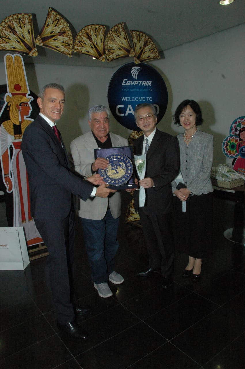وكان في استقبال ركاب الطائرة السفير الياباني بالقاهرة هيروشي أوكا وحرمه ورافقه الطيار محمد عليان نائب رئيس الشركة القابضة لمصر للطيران، وكان على متن الطائرة الدكتور زاهي حواس وزير الدولة لشئون الأثار سابقًا.