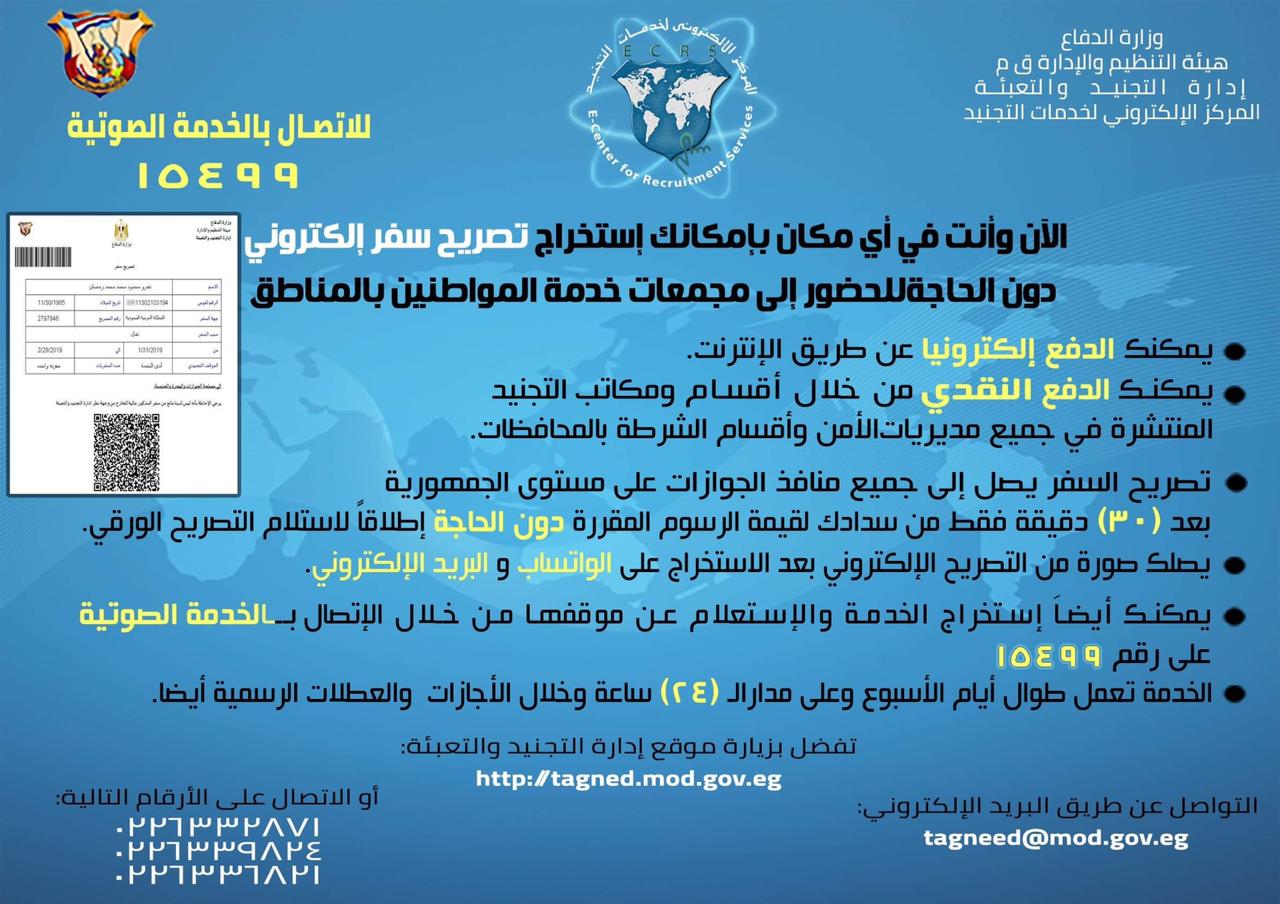 كما يمكن استخراج تصريح سفر إلكتروني من مصر، عبر موقع إدارة التجنيد والتعبئة التابعة لوزارة الدفاع المصرية، وتتولى مسؤولية التجنيد الإلزامي للشباب المصري الذين تتراوح أعمارهم بين 18 و30 عامًا.