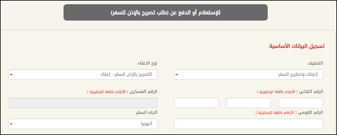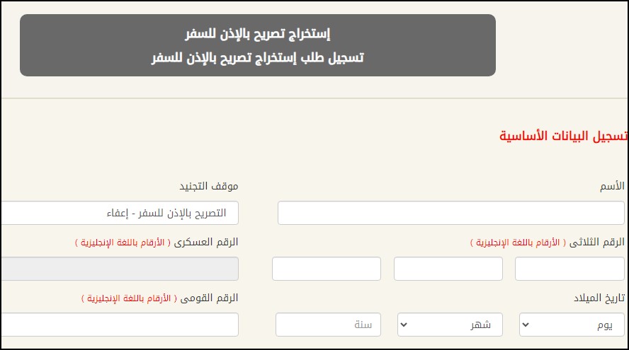 - ملء البيانات المطلوبة، بما في ذلك الاسم وتاريخ الميلاد والجنسية وموقف التجنيد ومدة السفر والغرض من السفر.