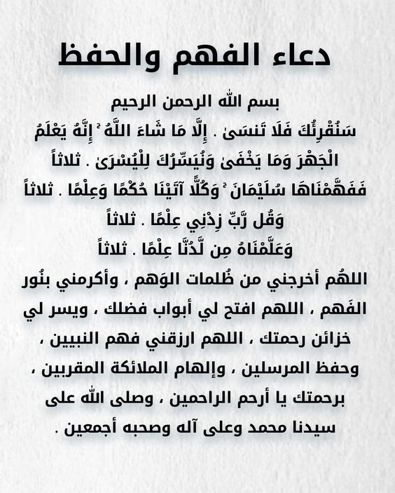 - اللهم هب لي من لدنك عقلًا مستنيرًا، وفهمًا سريعًا، وحفظًا بينًا، ونفسًا منشرحة مقبلة على الدراسة.