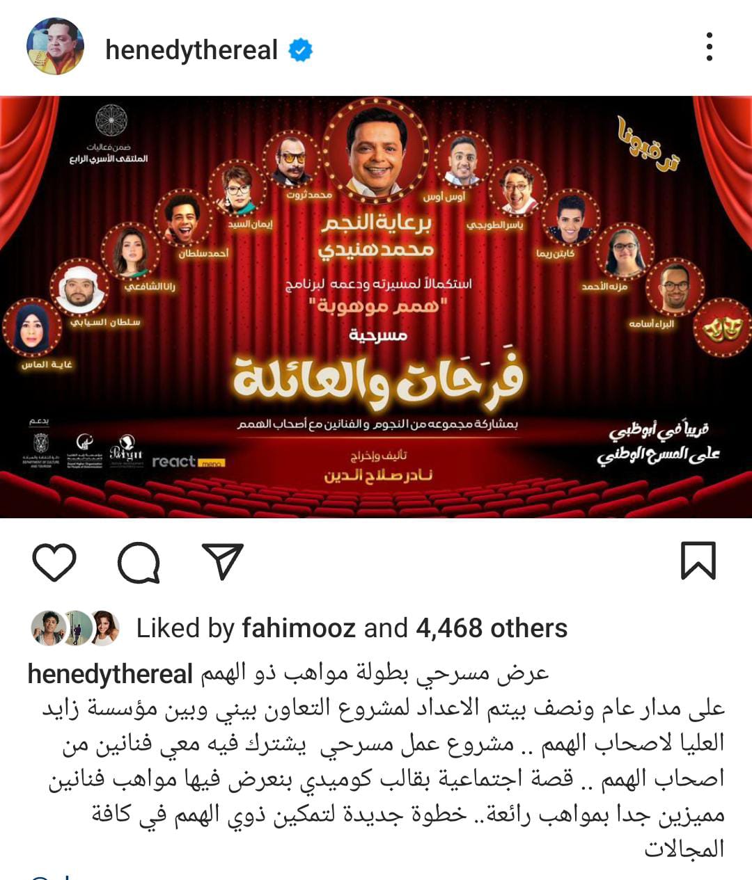 وفي سياق مختلف، علق محمد هنيدي على المسرحية، وذلك عبر حسابه الرسمي بـ انستجرام، قائلًا: عرض مسرحي بطولة مواهب ذوي الهمم على مدار عام ونصف بيتم الإعداد لمشروع التعاون بيني وبين مؤسسة زايد أصحاب الهمم.
