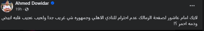 وكتب أحمد دويدار على صفحته الشخصية عبر فيسبوك: لايك إمام عاشور لصفحة الزمالك عدم احترام للنادي الأهلي وجمهوره شيء غريب جدا ولعيب عجيب قلبه أبيض ودمه أحمر؟!.