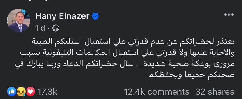 وفي وقت سابق من هذا الأسبوع قال الناظر، في منشوره: نعتذر لحضراتكم عن عدم قدرتي على استقبال أسئلتكم الطبية والإجابة عليها، ولا قدرتي على استقبال المكالمات التليفونية، بسبب مروري بوعكة صحية شديدة.. اسأل حضراتكم الدعاء وربنا يبارك في صحتكم جميعا ويحفظكم.