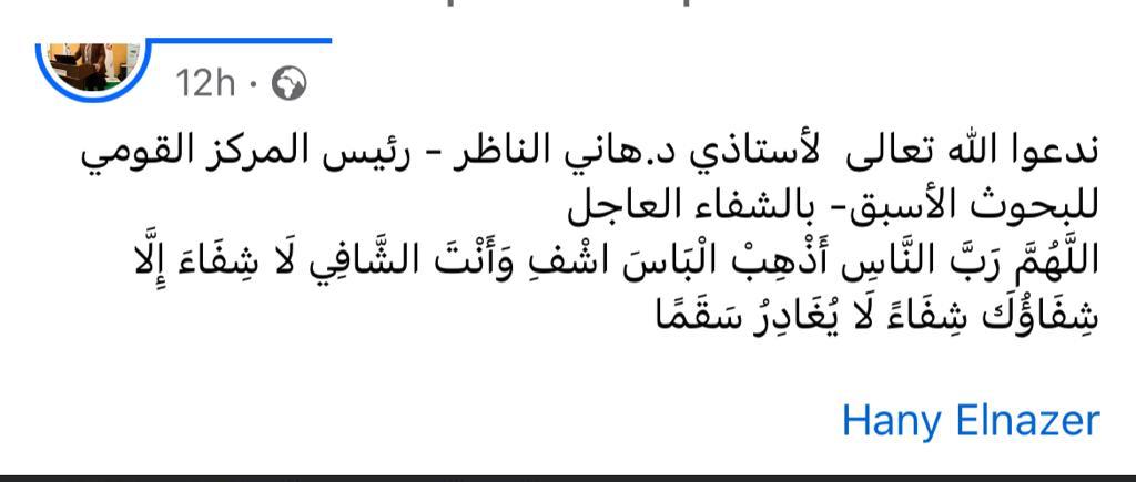 وقال الدكتور حسام الناظر: ندعوا الله تعالى لأستاذي الدكتور هاني الناظر رئيس المركز القومي للبحوث الأسبق، بالشفاء العاجل، اللهم رب الناس أذهب الباس اشف وأنت الشافي لا شفاء إلا شفاؤك شفاء لا يغادر سقما.
