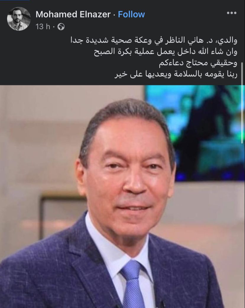 تداول عدد من رواد مواقع التواصل الاجتماعي، منشورات بشأن الحالة الصحية التي يمر بها الدكتور هاني الناظر، استشاري الأمراض الجلدية ومدير المعهد القومي للبحوث سابقًا، وسط حالة من الحزن، داعين الله له بالصحة والسلامة وأن يتماثل الشفاء العاجل.