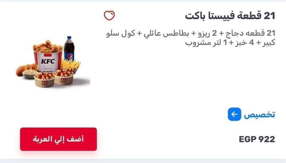 رفعت سلسة مطاعم كنتاكي المتخصصة في الوجبات السريعة، أسعار وجباتها في مصر، بعدما وصل سعر الباكت 21 قطعة، لقرابة الـ 1000 جنيه.