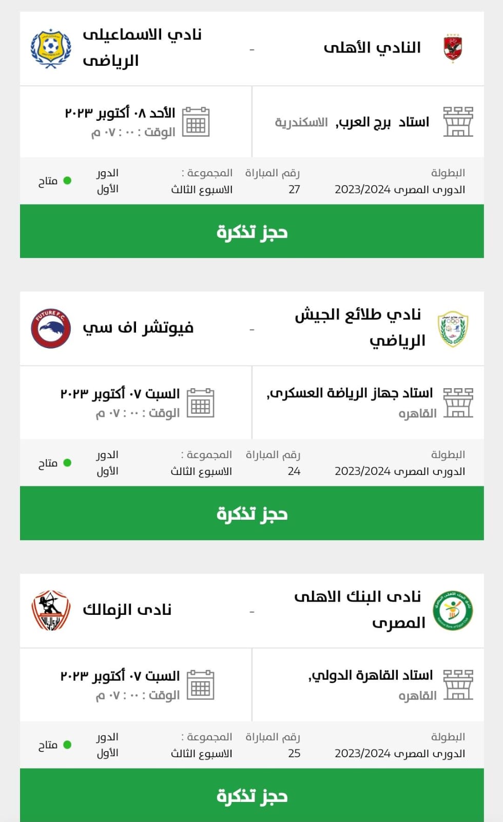 كما تم طرح تذاكر مباراة الزمالك والبنك الأهلي، علاوة على طرح تذاكر جميع مباريات الجولة الثالثة من بطولة الدوري الممتاز.
