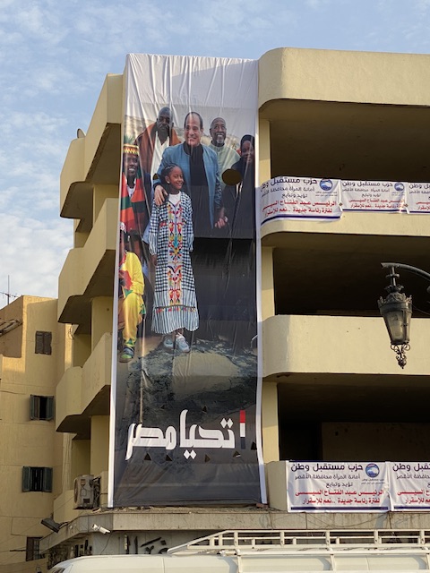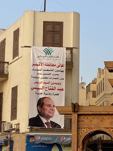 ورفعت صورة ضخمة أخرى للرئيس، وهو يتوسط عائلة نوبية من أهالي أسوان، فضلا عن صورة أخرى للرئيس يعلوها دعم من أهالي الأقصر لترشحة لفترة رئاسية جديدة.