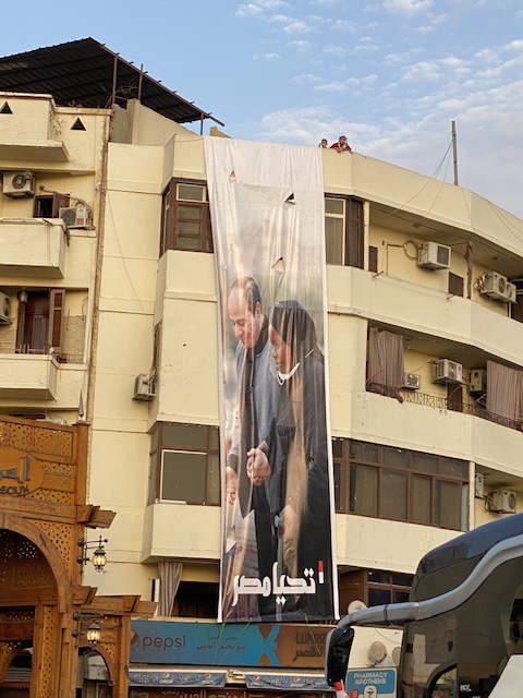 وعلت المباني المحيطة بميدان وساحة أبو الحجاج صور ضخمة للرئيس مع أطياف مختلفة من الشعب المصري، أبرزها وهو يسير بجوار سيدة مسنة تستند بعكازها وباليد الأخرى تستند على الرئيس في دلالة رائعة.