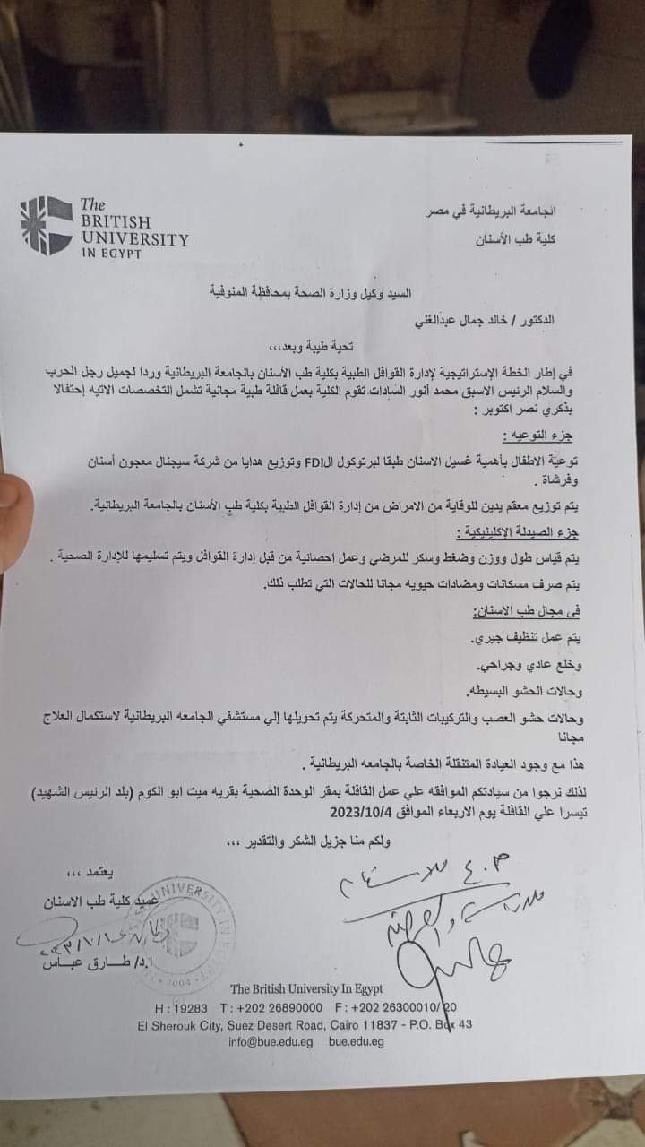 وجاء نص خطاب الجامعة البريطانية إلى مديرية الصحة بالمنوفية: في إطار الخطة الاستراتيجية لإدارة القوافل الطبية بكلية طب الأسنان بالجامعة البريطانية، وردا لجميل رجل الحرب والسلام، الرئيس الأسبق محمد أنور السادات، تقوم الكلية بعمل قافلة طبية مجانية تشمل التخصصات الآتية احتفالا بذكرى نصر أكتوبر: