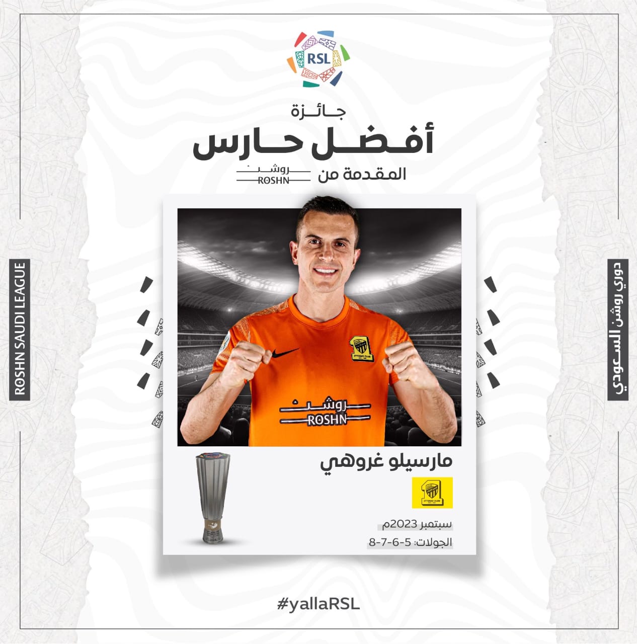 وحصل اللاعب البرازيلي مارسيلو جروهي، حارس فريق اتحاد جدة، على جائزة حارس الشهر، بعد تألقه مع فريقه في بطولة الدوري السعودي للمحترفين.