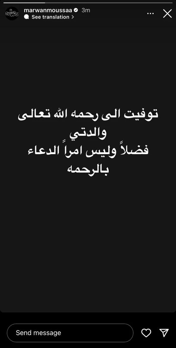 وكتب مروان موسى، منشورًا عبر حسابه الشخصي بموقع تبادل الصور والفيديوهات انستجرام، حيث قال: توفيت إلى رحمة الله تعالى والدتي.. فضلا وليس أمرا الدعاء بالرحمة.