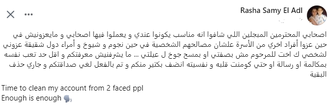 وتابعت رشا سامي العدل: في نجوم وشيوخ وأمراء دول شقيقة عزوني لشخصي كأخت للمرحوم، مش بصفتي أو بمسح جوخ لعيلتي.. ميشرفنيش معرفتكم وأقل حد تعب نفسه بمكالمة، أو رسالة أو حتى كومنت قلبه ونفسيته أنضف بكتير منكم، وتم بالفعل إلغاء صداقتكم وجار حذف البقية.