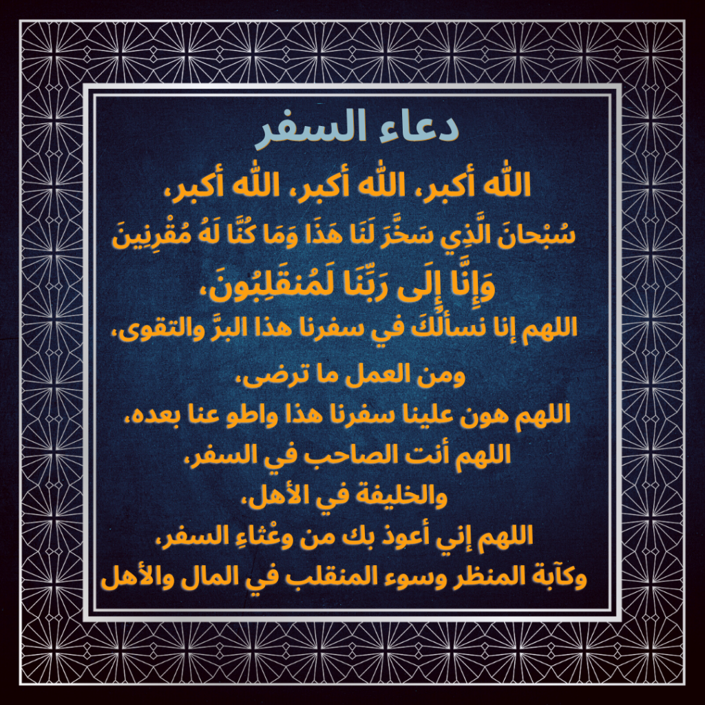 "اللهم إنا نسألك في سفرنا هذا البر والتقوى، ومن العمل ما ترضى، اللهم هون علينا سفرنا هذا، واطو عنا بعده، اللهم أنت الصاحب في السفر، والخليفة في الأهل، اللهم إني أعوذ بك من وعثاء السفر، وكآبة المنظر، وسوء المنقلب في المال والأهل".