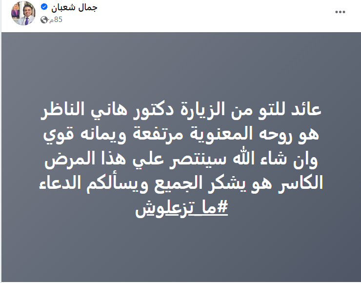 وقال الدكتور جمال شعبان خلال بوست نشره على صفحته الشخصية فيسبوك: عائد للتو من زيارة دكتور هاني الناظر، هو روحه المعنوية مرتفعة وإيمانه قوي، وإن شاء الله سينتصر على هذا المرض الكاسر هو يشكر الجميع ويسألكم الدعاء.