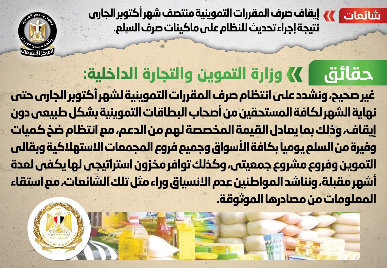 وفي هذا الصدد، تواصل المركز الإعلامي لمجلس الوزراء مع وزارة التموين والتجارة الداخلية، والتي نفت تلك الأنباء، مُؤكدةً أنه لا صحة لإيقاف صرف المقررات التموينية منتصف شهر أكتوبر الجاري نتيجة إجراء تحديث للنظام على ماكينات صرف السلع.