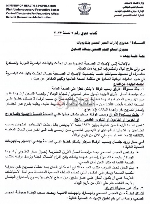 وجهت وزارة الصحة والسكان، ممثلة في قطاع الطب الوقائي، تعليمات إلى مديري إدارة الحجر الصحي بالمديريات، بشأن تحديث الإجراءات الصحية حيال الجثث والرفات البشرية الواردة والصادرة من وإلى الخارج في ضوء النشرات الوبائية الصادرة عن منظمة الصحة العالمية وتقييم المخاطر.