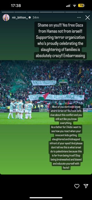 ومن جانبه، قام لاعب كرة القدم الإسرائيلي نير بيتون نجم سيلتك السابق، بانتقاد جماهير فريقه الأسبق على ما قاموا به اليوم بعبارات حادة، أبرزها أنهم مخطئين في ذلك الأمر، ويقوموا دائمًا بدعمهم دون تقييم الأمور ومعرفة ما يحدث حقًا.