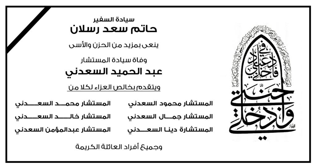 وتقدم الدكتور حاتم رسلان، بخالص العزاء إلى المستشار محمود السعدني، في رحيل الفقيد.