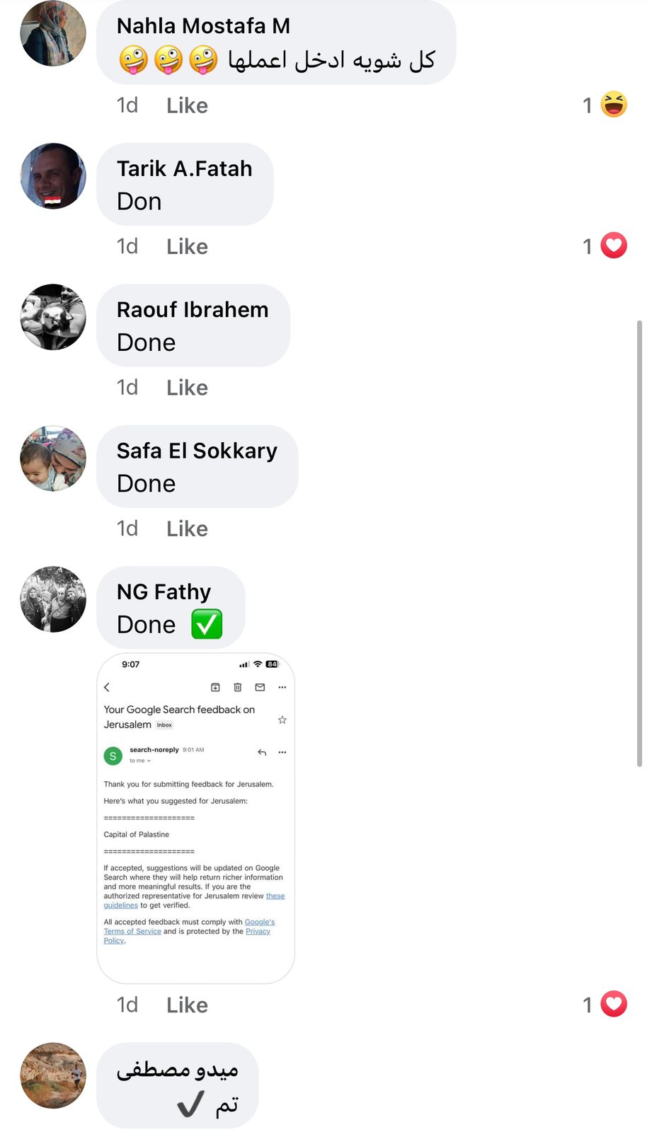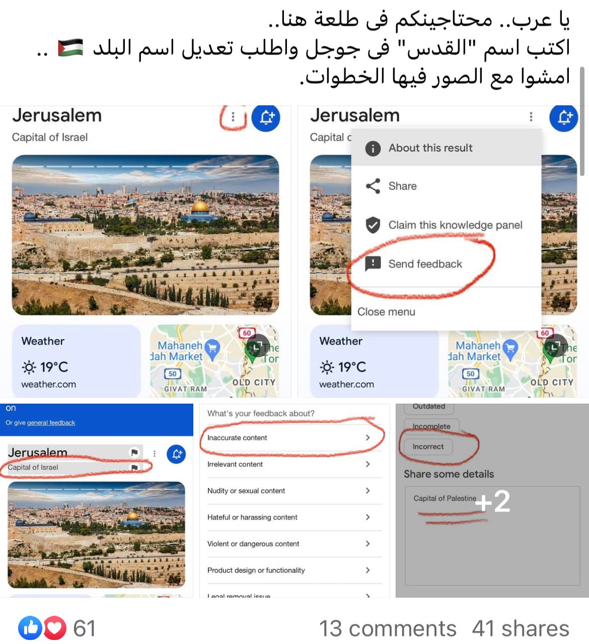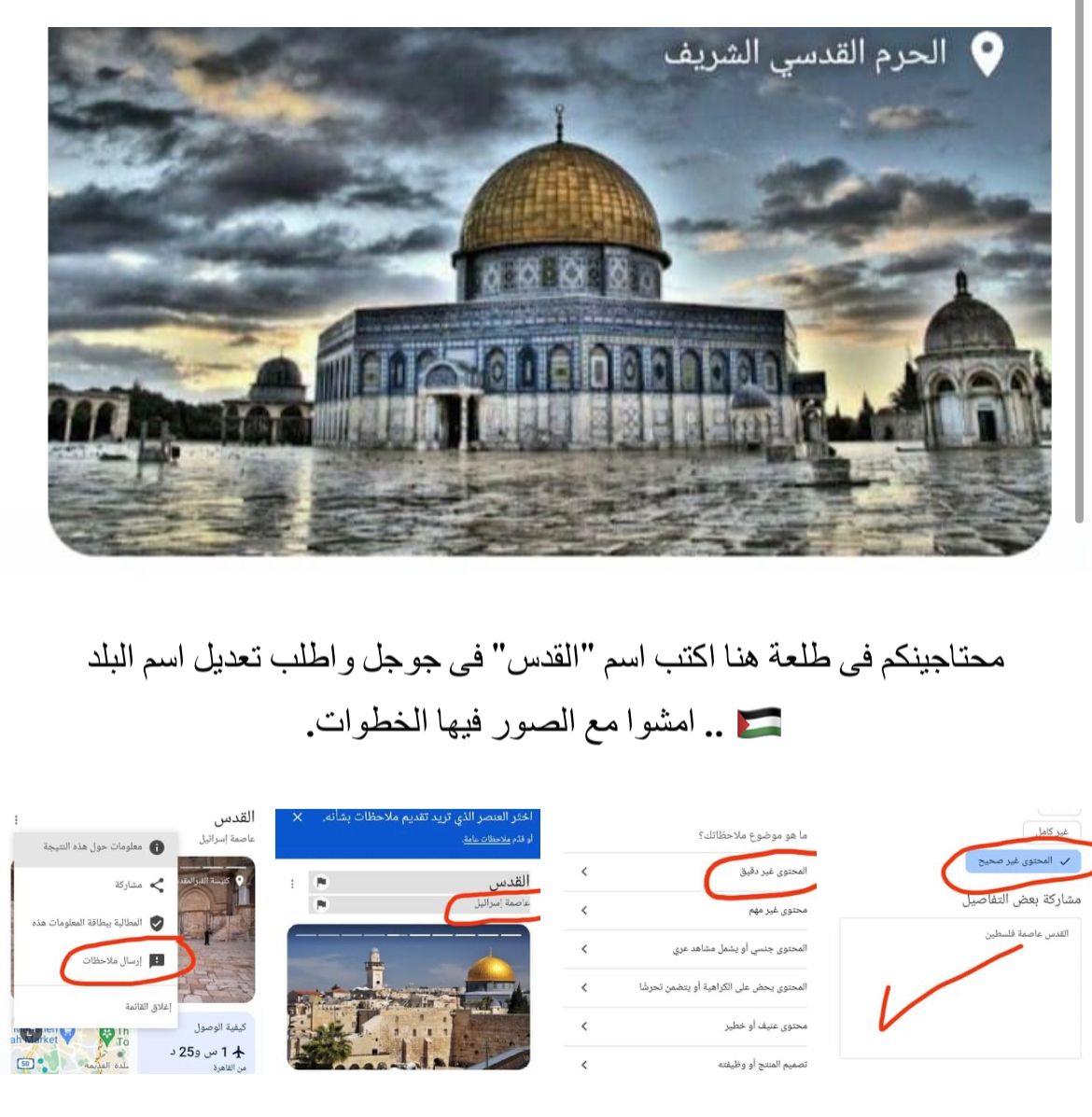 ويحث رواد السوشيال ميديا أكبر عدد من الناس على المشاركة في تلك الحملة، حتى تتمكن من النجاح، وشرحوا الخطوات التي تمثلت في الدخول إلى موقع جوجل والضغط على 3 نقاط بجوار اسم القدس، ثم اختيار إرسال ملاحظات، وبعدها الضغط على كلمة عاصمة إسرائيل، واختيار المحتوى غير دقيق، واختيار المحتوى مضلل، ثم كتابة القدس عاصمة فلسطين وبعدها إرسال.