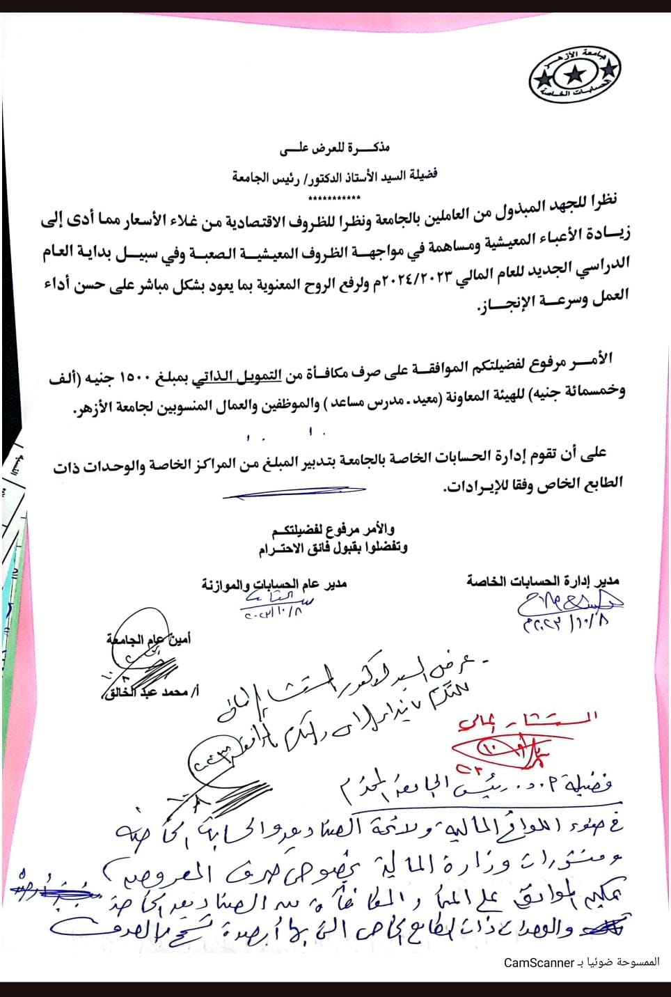 وحصل القاهرة 24 على نسخة من القرار، حيث جاء نصه: نظرا للجهد المبذول من العاملين بالجامعة ونظرا للظروف الاقتصادية من غلاء الأسعار مما أدى إلى زيادة الأعباء المعيشية ومساهمة في مواجهة الظروف المعيشية الصعبة وفي سبيل بداية العام الدراسي الجديد للعام المالي 2023 /2024، ولرفع الروح المعنوية بما يعود بشكل مباشر على حسن أداء العمل وسرعة الإنجاز، الأمر مرفوع لفضيلتكم الموافقة على صرف مكافأة من التمويل الذاتي بمبلغ 1500 جنيه للهيئة المعاونة (معيد - مدرس مساعد) والموظفين والعمال المنسوبين لجامعة الأزهر، على أن تقوم إدارة الحسابات الخاصة بالجامعة بتدبير المبلغ من المراكز الخاصة والوحدات ذات الطابع الخاص وفقا للإيرادات والأمر مرفوع لفضيلتكم وتفضلوا بقبول فائق الاحترام.