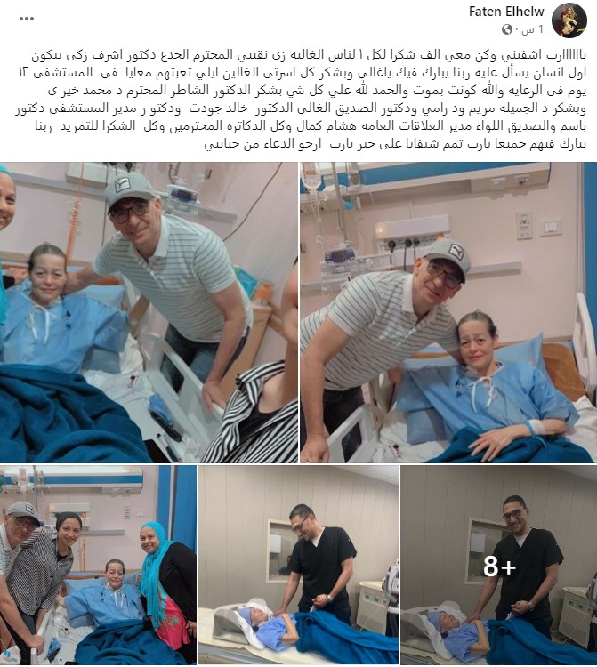 نشرت فاتن الحلو الصور عبر حسابها الشخصي بموقع فيسبوك، وعلقت عليها قائلة: يارب أشفيني وكن معي، شكرًا لكل من تواصل معي وعلى رأسهم نقيبي المحترم الدكتور أشرف زكي، أول إنسان يسأل عليا ربنا يبارك فيك يا غالي وبشكر كل أسرتي الغالين تعبتهم معايا في المستشفى.