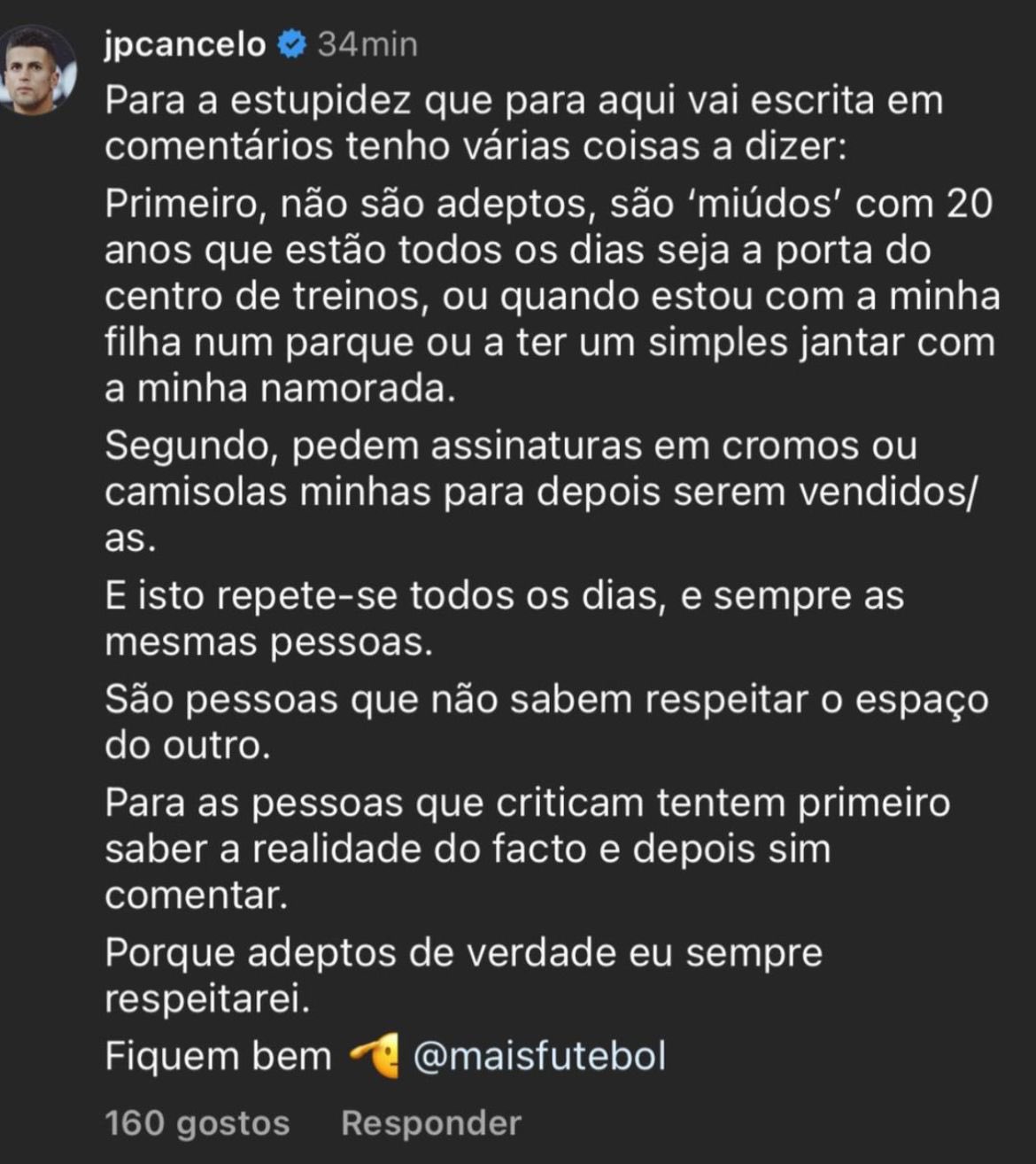 وأضاف كانسيلو: ثانيًا، يطلبون التوقيع على الملصقات أو القمصان لبيعها لاحقًا، ويتكرر هذا كل يوم، ودائمًا نفس الأشخاص.. إنهم أشخاص لا يعرفون كيفية احترام الآخرين، بالنسبة للأشخاص الذين ينتقدون، حاولوا أولًا معرفة الحقيقة ثم التعليق؛ لأن المشجعين الحقيقيين سيُحترمون دائمًا.