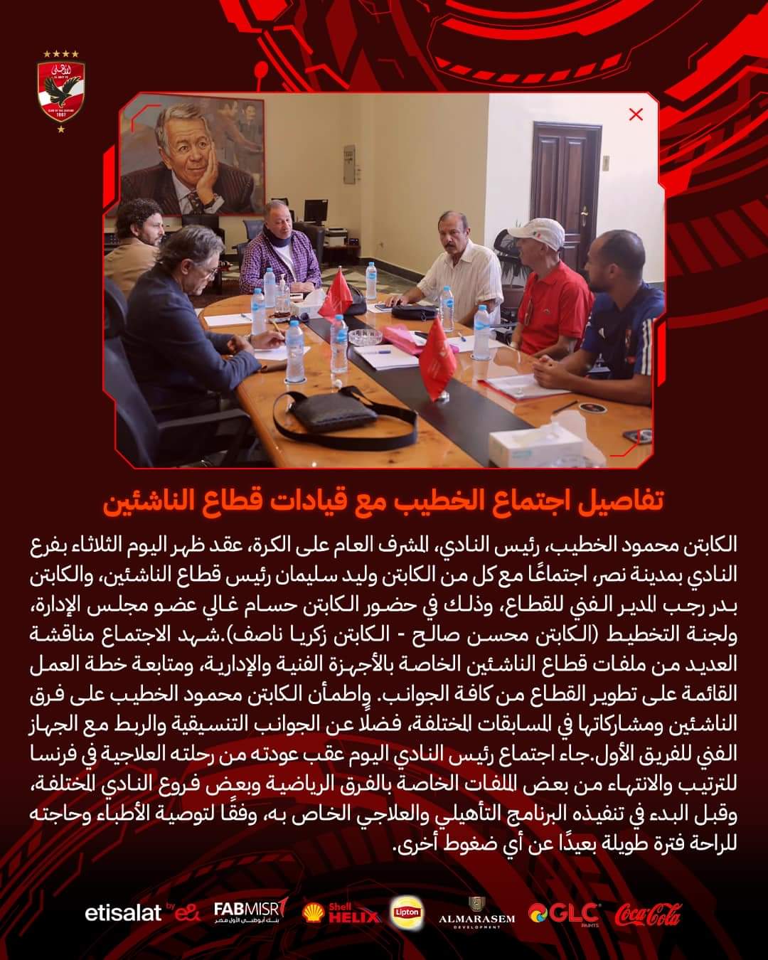 عقد محمود الخطيب، رئيس النادي الأهلي المشرف العام على الكرة، ظهر اليوم الثلاثاء بفرع النادي بمدينة نصر، اجتماعًا مع كل من: وليد سليمان رئيس قطاع الناشئين، وبدر رجب المدير الفني للقطاع، كما حضر الاجتماع حسام غالي عضو مجلس الإدارة، ولجنة التخطيط محسن صالح وزكريا ناصف.