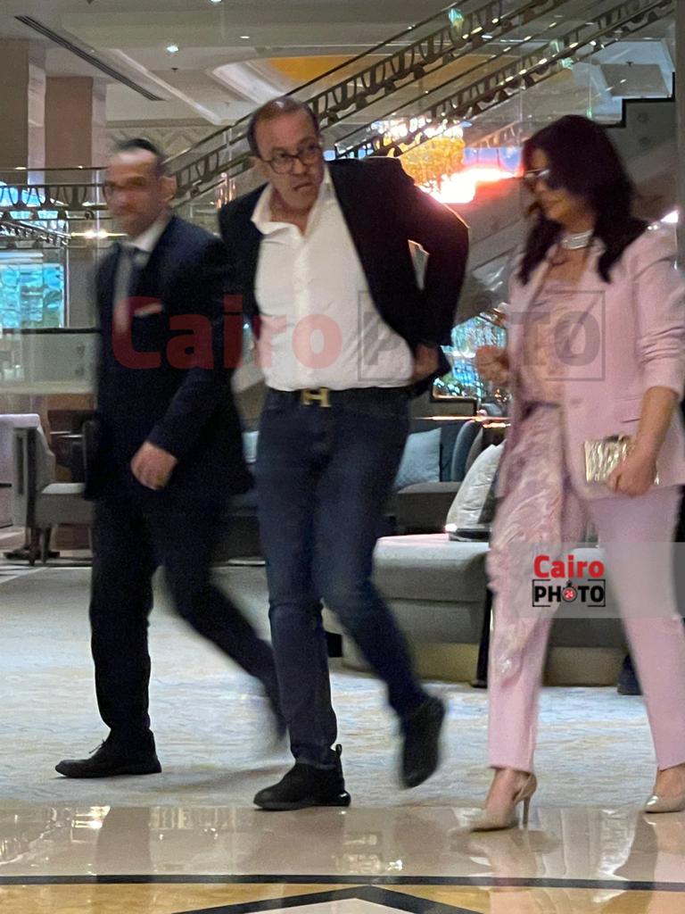 وصول منى الشاذلي وزوجها سمير يوسف إلى حفل زفاف تامر عاشور والإعلامية نانسي نور