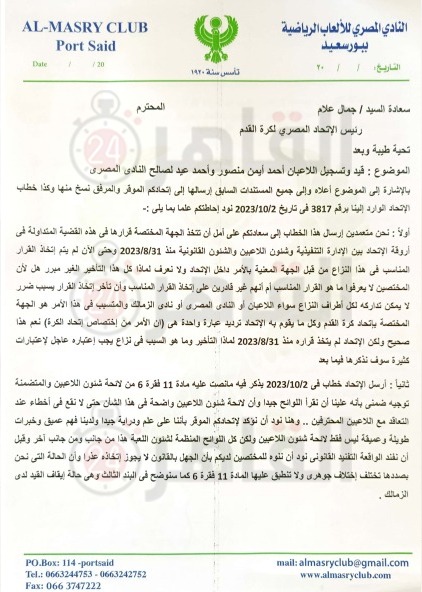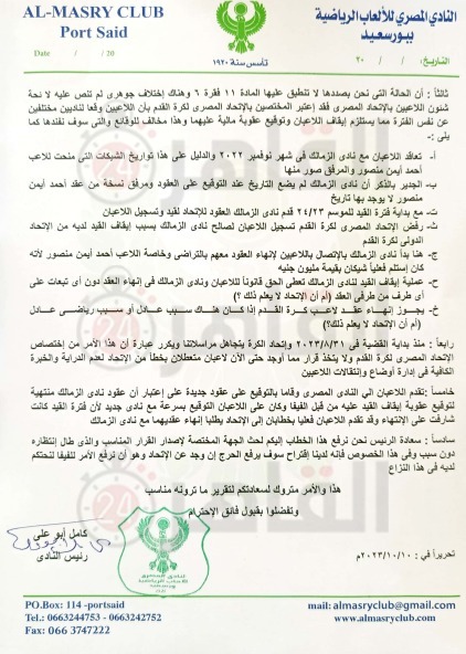 أولًا: نحن متعمدين إرسال هذا الخطاب إلى سعادتكم على أمل أن تتخذ الجهة المختصة قرارها في هذه القضية المتداولة في أروقة الاتحاد بين الإدارة التنفيذية وشئون اللاعبين والشئون القانونية منذ 2023/8/31 وحتى الآن لم يتم اتخاذ القرار المناسب في هذا النزاع من قبل الجهة المعنية بالأمر داخل الاتحاد ولا نعرف لماذا كل هذا التأخير غير المبرر هل لأن المختصين لا يعرفون ما هو القرار المناسب أم أنهم غير قادرين على اتخاذ القرار المناسب وأن تأخر اتخاذ القرار يسبب ضررًا لا يمكن تداركه لكل أطراف النزاع سواء اللاعبين أو النادي المصري أو نادي الزمالك والمتسبب في هذا الأمر هو الجهة المختصة باتحاد كرة القدم وكل ما يقوم به الاتحاد ترديد عبارة واحدة هي أن الأمر من اختصاص اتحاد الكرة) نعم هذا صحيح ولكن الاتحاد لم يتخذ قراره منذ 2023/8/31 لماذا التأخير وما هو السبب في نزاع يجب اعتباره عاجلا لاعتبارات كثيرة سوف نذكرها فيما بعد التعاقد.