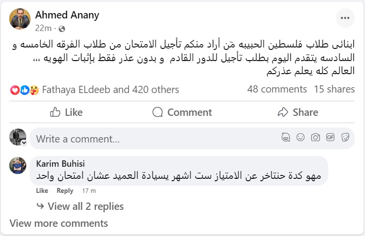 وكتب الدكتور أحمد عناني: أبنائي طلاب فلسطين الحبيبة من أراد منكم تأجيل الامتحان من طلاب الفرقة الخامسة والسادسة يتقدم اليوم بطلب تأجيل للدور القادم وبدون عذر؛ فقط بإثبات الهوية.. العالم كله يعلم عذركم.