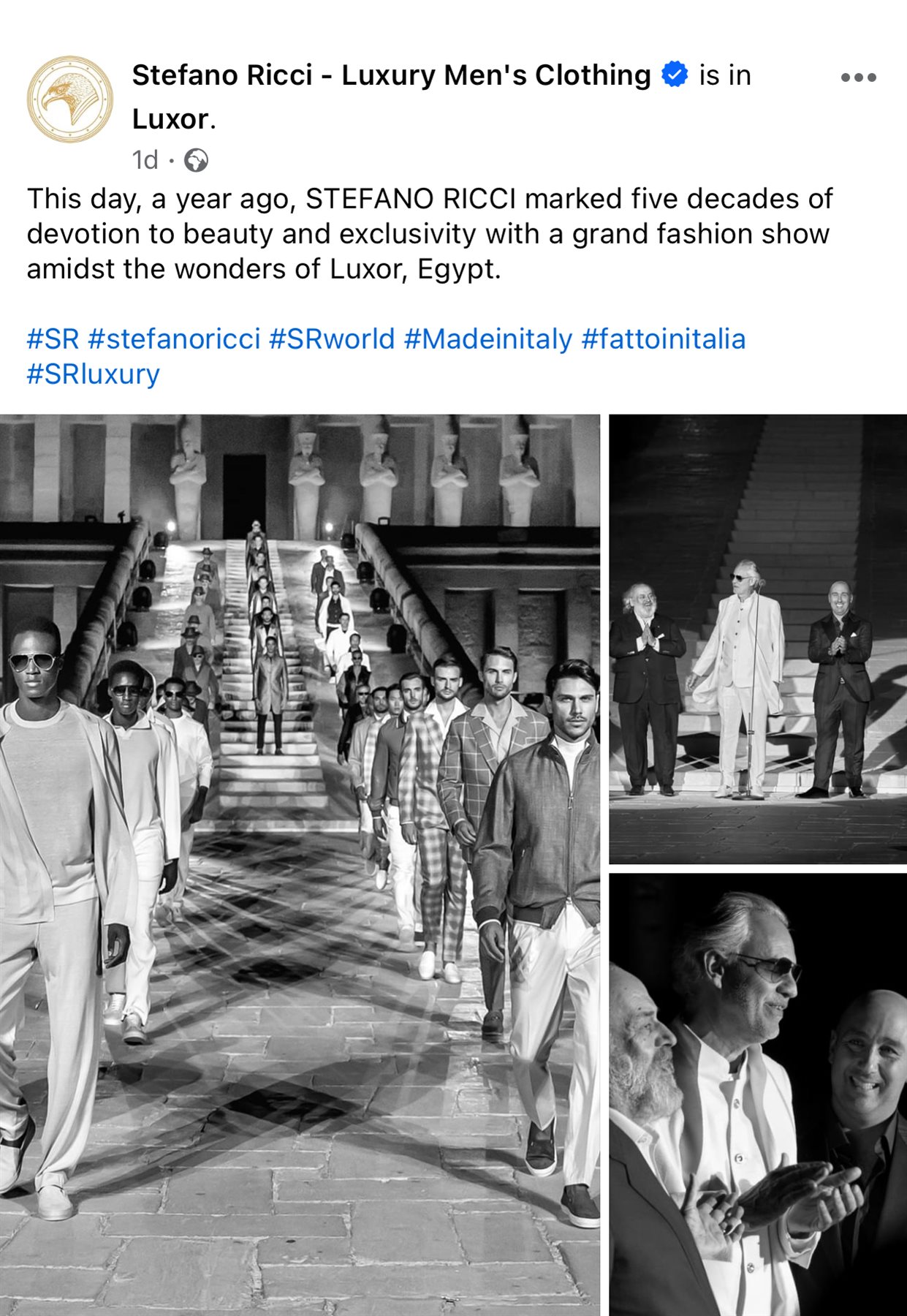 وقالت الصفحة الرسمية لدار الأزياء العالمية الإيطالية الشهيرة ستيفانو ريتشي في منشورها: في مثل هذا اليوم، قبل عام، احتفل ستيفانو ريتشي بخمسة عقود من التفاني في الجمال والتفرد من خلال عرض أزياء كبير وسط عجائب الأقصر المصرية.
