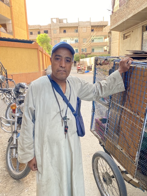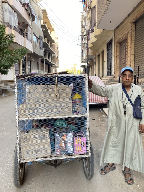 يسير في شوارع الأقصر بتروسيكل صغير متهالك بصندوق حديدي من الشبك مطلقا صوت صفارتة الشهيرة التي يعلقها في رقبتة فيهرع إلية الصغار والكبار مستبشرين بقدومة يشترون منة الحلوى والبسكويت واللبان.