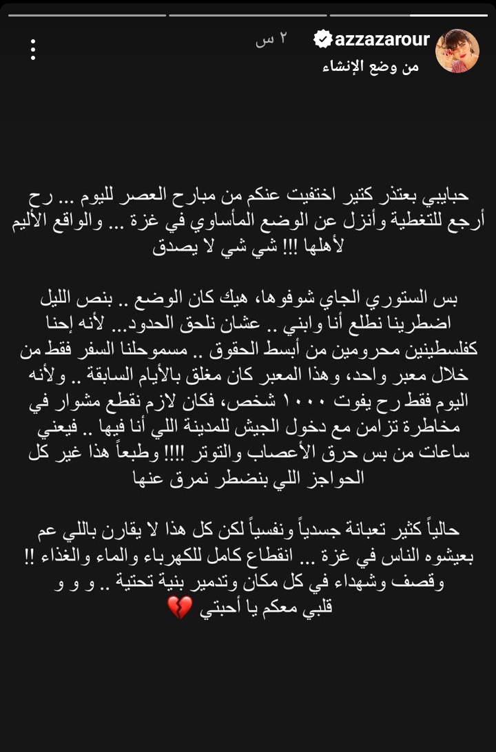 ونشرت عزة زعرور ستوري، عبر حسابها الشخصي بموقع انستجرام جاء فيه: بنص الليل اضطرينا نطلع أنا وابني علشان نلحق الحدود لأنه إحنا كفلسطينيين محرومين من أبسط الحقوق مسموحلنا السفر فقط من خلال معبر واحد وهذا المعبر كان مغلق بالأيام السابقة.