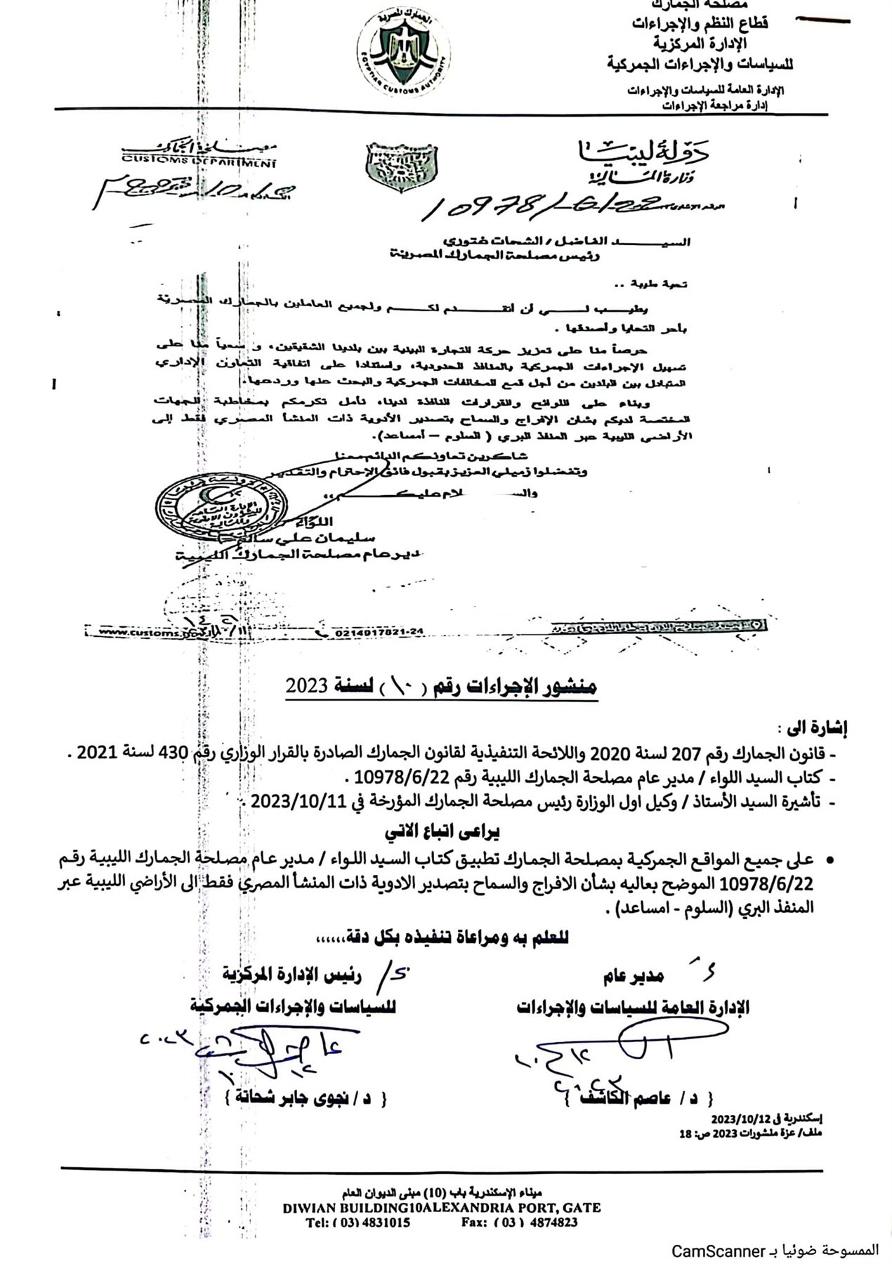 وبناء على هذا الخطاب، أصدرت مصلحة الجمارك، خطابا إلى منفذ السلوم اليوم الخميس في هذا الشأن.