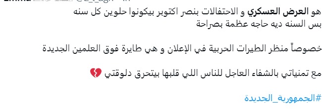 وجاءت أغلب التعليقات داعمة للقوات المسلحة المصرية، وداعية لشهادئها بالرحمة، وفيما جاءت الكثير منها منبهرة بالعر الذي تقدمه القوات في هذا العام احتفالًا بالذكرى الخمسين لنصر أكتوبر.