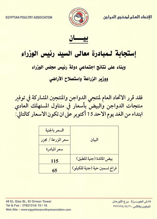 قرر الاتحاد العام لمنتجي الدواجن والمنتجين المشاركة في توفير منتجات الدواجن والبيض بأسعار في منتاول المستهلك العادي ابتداء من الغد يوم الأحد 15 أكتوبر، على أن تكون الأسعار كالتالي: