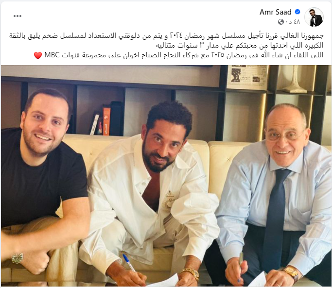 وكتب عمرو سعد عبر حسابه على فيسبوك، الآتي: جمهورنا الغالي قررنا تأجيل مسلسل شهر رمضان 2024، ويتم من دلوقتي الاستعداد لمسلسل ضخم يليق بالثقة الكبيرة اللي أخدتها من محبتكم على مدار 3 سنوات متتالية، إلى اللقاء إن شاء الله في رمضان 2025 مع شركاء النجاح الصباح إخوان على مجموعة قنوات MBC.
